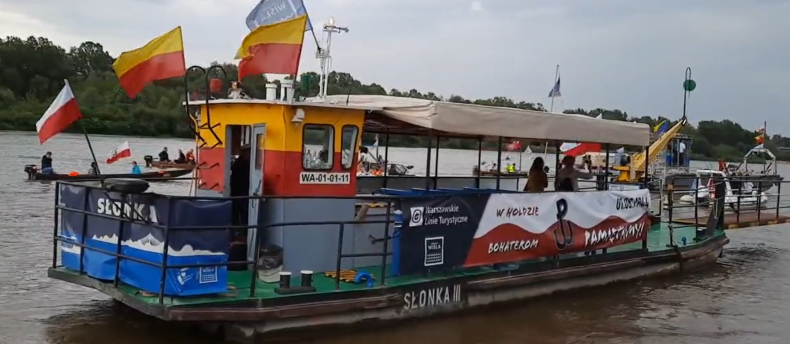 Zamieścił też film z parady, na którym przepływa obok promu turystycznego Słonka, na którym powiewają flagi Warszawy a na burcie ma baner z hasłem "W hołdzie Bohaterom. Pamiętamy!". W tle słychać melodię "Międzynarodówki".