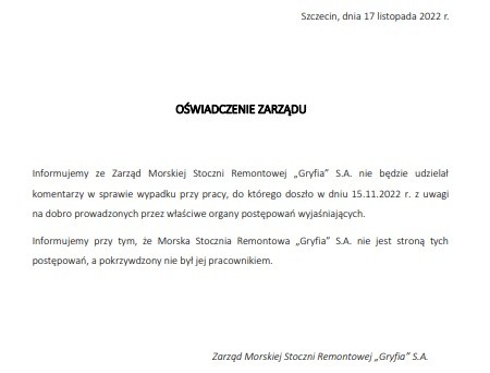 Tymczasem Gryfia wydała na swojej stronie krótkie oświadczenie, w którym informuje, że z uwagi na dobro postępowań wyjaśniających nie będzie komentować szczegółów wypadku. „Informujemy, że <Gryfia> S.A. Nie jest stroną tych postępowań, a pokrzywdzony nie był jej pracownikiem” – czytamy.