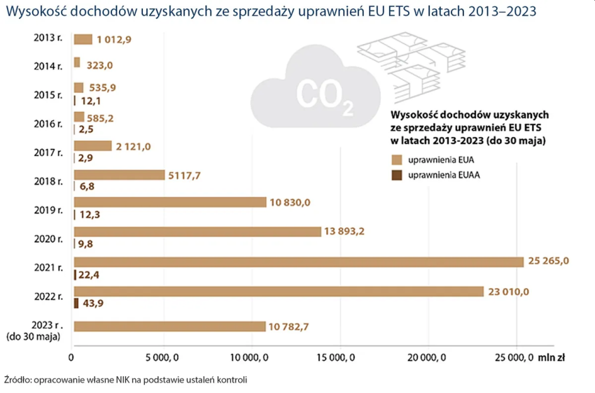Polska ma możliwość sprzedaży niewykorzystanych uprawnień do emisji gazów cieplarnianych wewnątrz EU. W ten sposób nasz kraj w ostatnich latach uzyskiwał konkretne przychody – byliśmy pod tym względem drugim krajem w Unii, wyprzedzili nas jedynie Niemcy. W latach 2013-2023 do Polski z handlu ETS EU powędrowało 94 mld zł, przy czym znacząca większość, bo aż 84 mld zł w latach 2019-2023. Zgodnie z regulacjami, przynajmniej połowa pozyskanych w ten sposób środków powinna zasilić działania związane z neutralnością klimatyczną i zieloną transformacją, m.in. w energetykę odnawialną. Właśnie to próbował skontrolować NIK.