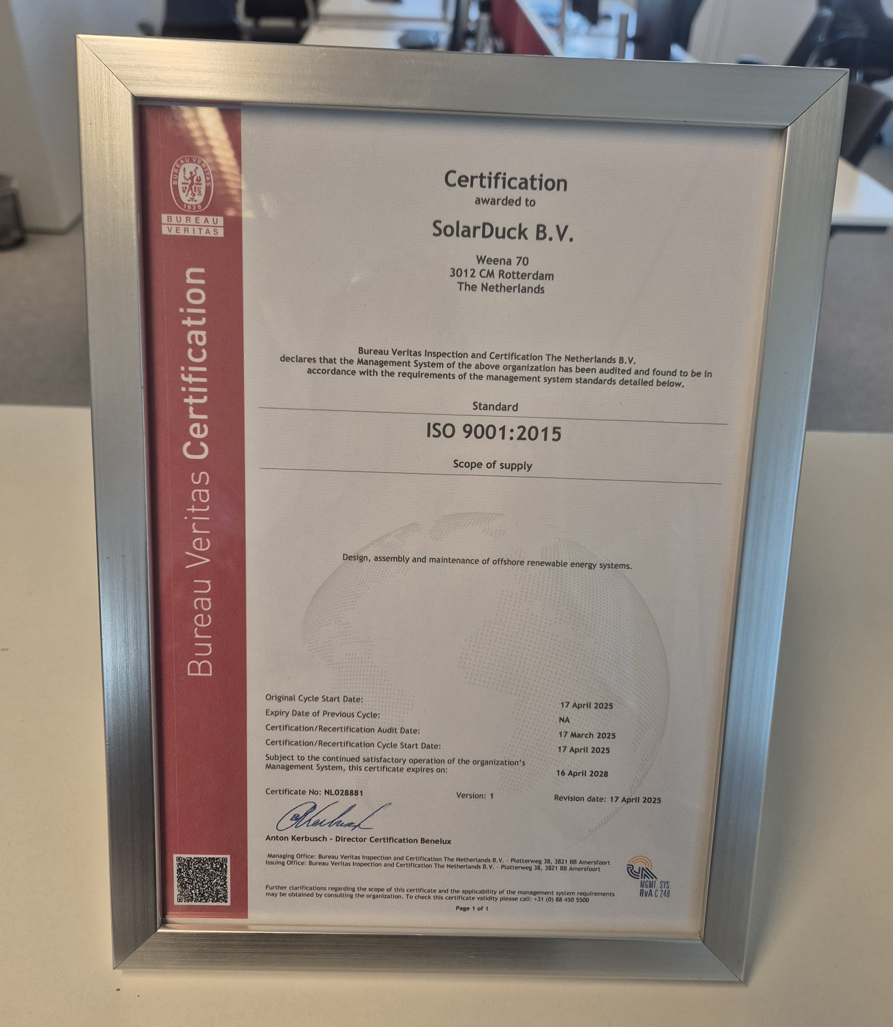 Certyfikat ISO 9001 to znany standard systemów zarządzania jakością. Został przyznany przez Bureau Veritas, a zdaniem SolarDuck ma to być kolejnym krokiem w dalszym rozwoju firmy. Co istotne, nieco wcześniej podmiot uzyskał certyfikat EcoVadis, podkreślając zaangażowanie zarówno na jakości, jak i zrównoważonym rozwoju, w tym odpowiedzialnych praktykach biznesowych. Przedsiębiorstwo liczy, że dzięki tym dokumentom uzyska status zaufanego partnera w ramach globalnej transformacji energetycznej nastawionej na technologie przyjazne środowisku i ograniczające zmiany klimatu, w tym globalne ocieplenie.