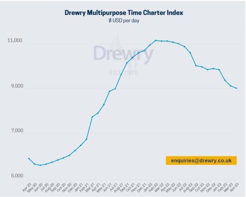Spadki frachtów i stawek czarterów w tym segmencie żeglugi powoli wyhamowują. Co prawda w kwietniu zaobserwowano na przykład w indykatorze Drewry Multipurpose Time Charter Index dalsze niewielkie spadki, ale nie są one tak drastyczne jak miało to miejsce w poprzednich miesiącach. Wspomniany indeks osiągnął w kwietniu poziom około USD 9,175.