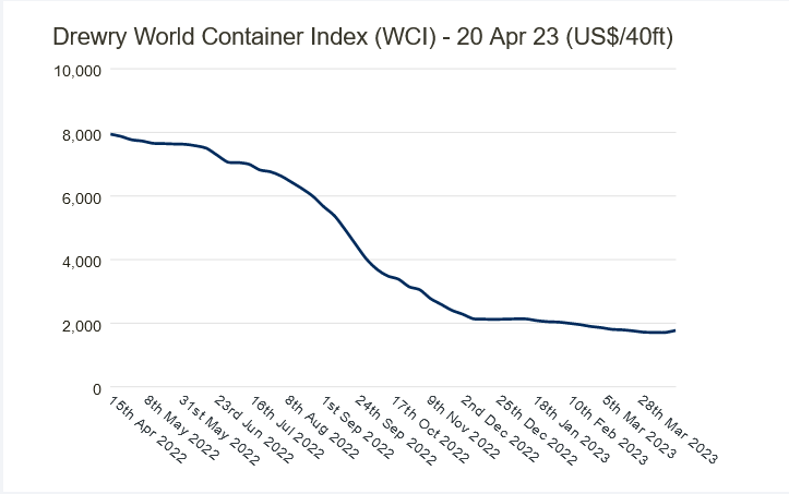 Ostatnie tygodnie to stabilizacja niskich parametrów frachtowych występujących w transporcie kontenerowym. Po dłuższym okresie gwałtownych spadków, następowało wyhamowywanie negatywnych trendów, co rozpoczęło się pod koniec 2022 roku. Sytuację tę doskonale obrazował jeden z indykatorów branżowych, tj. Drewry World Container Index. W tygodniu 16 zaobserwowano nawet lekki wzrost indeksów, oscylujący wokół 4%, licząc miesiąc do miesiąca. Tym samym wspomniany indeks osiągnął poziom około 1,770 USD. Jak podaje firma analityczna Drewry był to pierwszy odnotowany wzrost od czasu 15 tygodni.