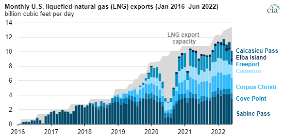 Od listopada 2021 roku amerykańskie zdolności eksportowe LNG wzrosły o 1,9 Bcf/d nominalnie (2,1 Bcf/d w szczycie). Zwiększenie przepustowości obejmowało projekty w Sabine Pass LNG, 18 nowych ciągów skraplania w Calcasieu Pass LNG oraz zwiększenie zdolności produkcyjnej LNG w zakładach Sabine Pass i Corpus Christi LNG. EIA szacuje, że w lipcu 2022 roku zdolność skraplania LNG w USA wynosiła średnio 11,4 Bcf/d, natomiast szczytowa zdolność sięgnęła poziomu nawet 13,9 Bcf/d.