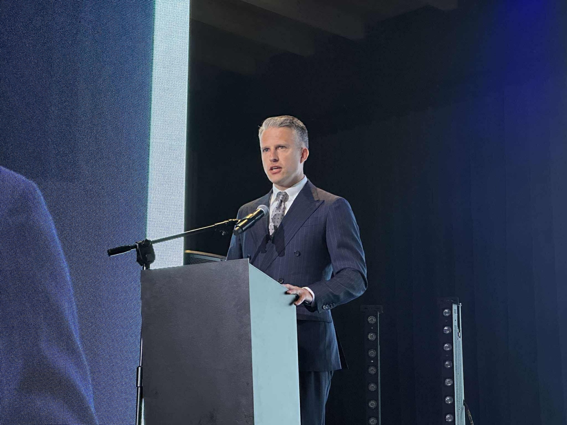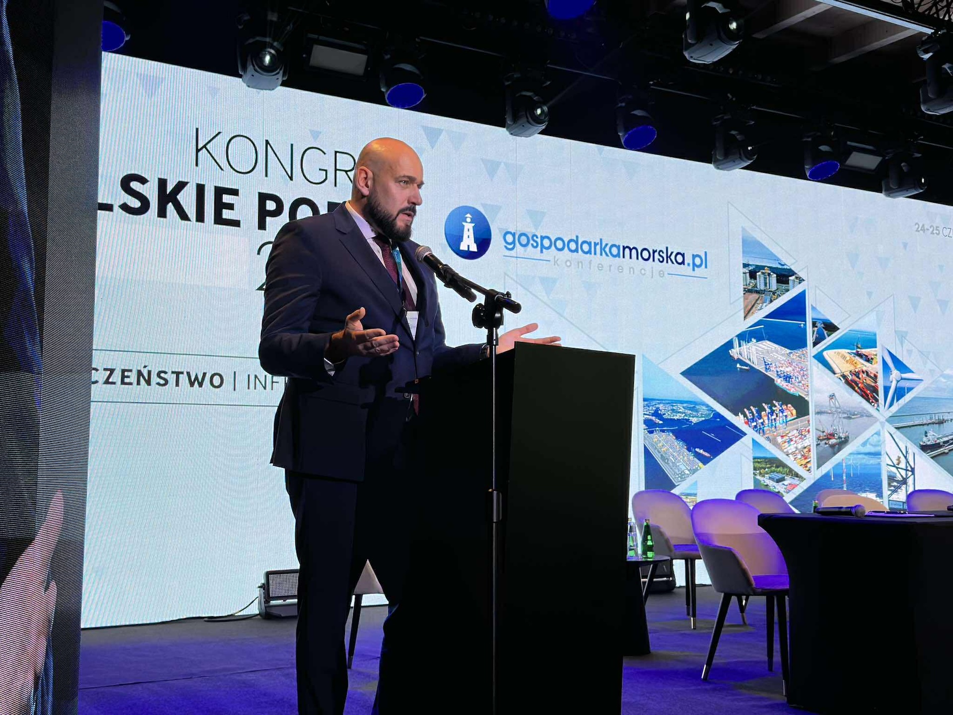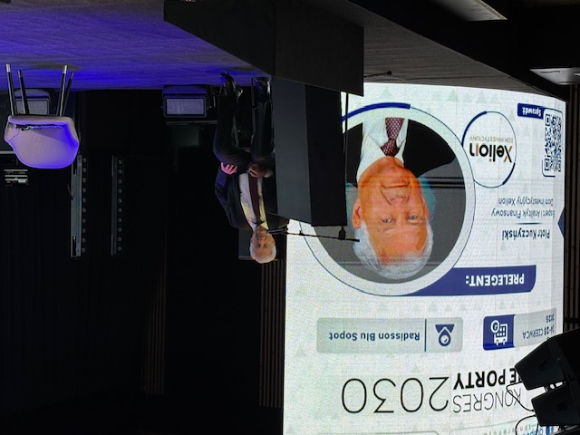 Mateusz Kowalewski ze sceny dziękuje wszystkim zaangażowanym w Kongres Polskie Porty 2030 partnerom. "W 2023 roku, kiedy organizowaliśmy Kongres po raz pierwszy, miałem poważne wątpliwości, czy dotrwamy do 2030. Dzisiaj jestem przekonany, że to jest w naszym zasięgu."