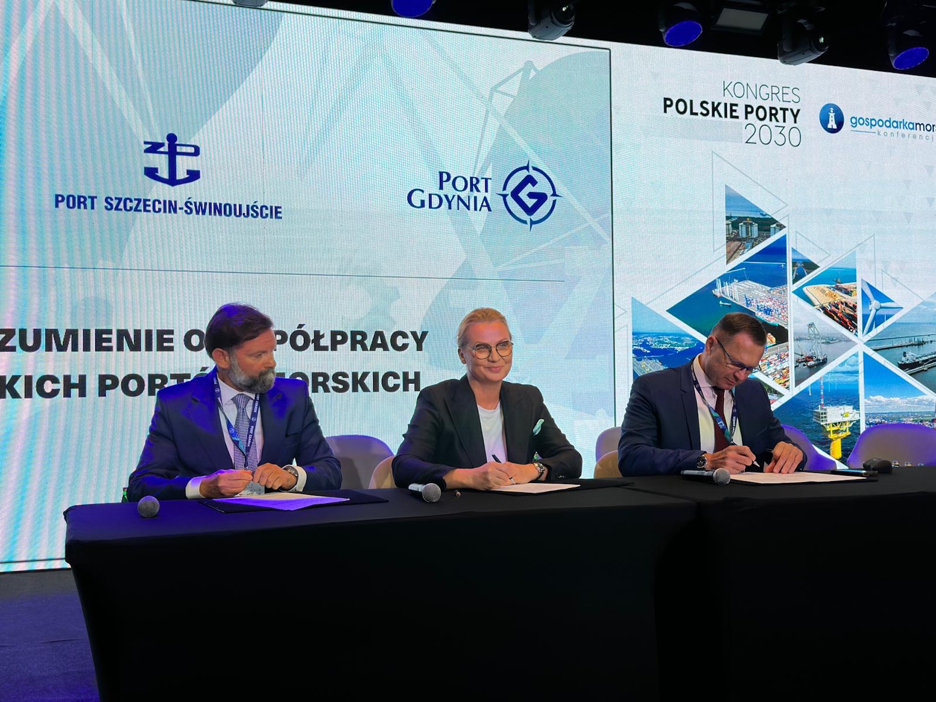 Prezesi zarządów polskich portów o strategicznym znaczeniu dla gospodarki morskiej - Dorota Pyć, prezes Zarządu Morskiego Portu Gdańsk, Piotr Gorzeński, prezes Zarządu Morskiego Portu Gdynia, Jarosław Siergiej, prezes Zarządu Morskich Portów Szczecin-Świnoujście podpisują porozumienie o współpracy między portami. To ważny moment - po raz pierwszy polskie porty oficjalnie sygnują porozumienie, które stanie się fundamentem strategicznej kooperacji na rzecz wzmocnienia pozycji Polski na światowych szlakach logistycznych, ale także wzmocni konkurencyjność i bezpieczeństwo.
