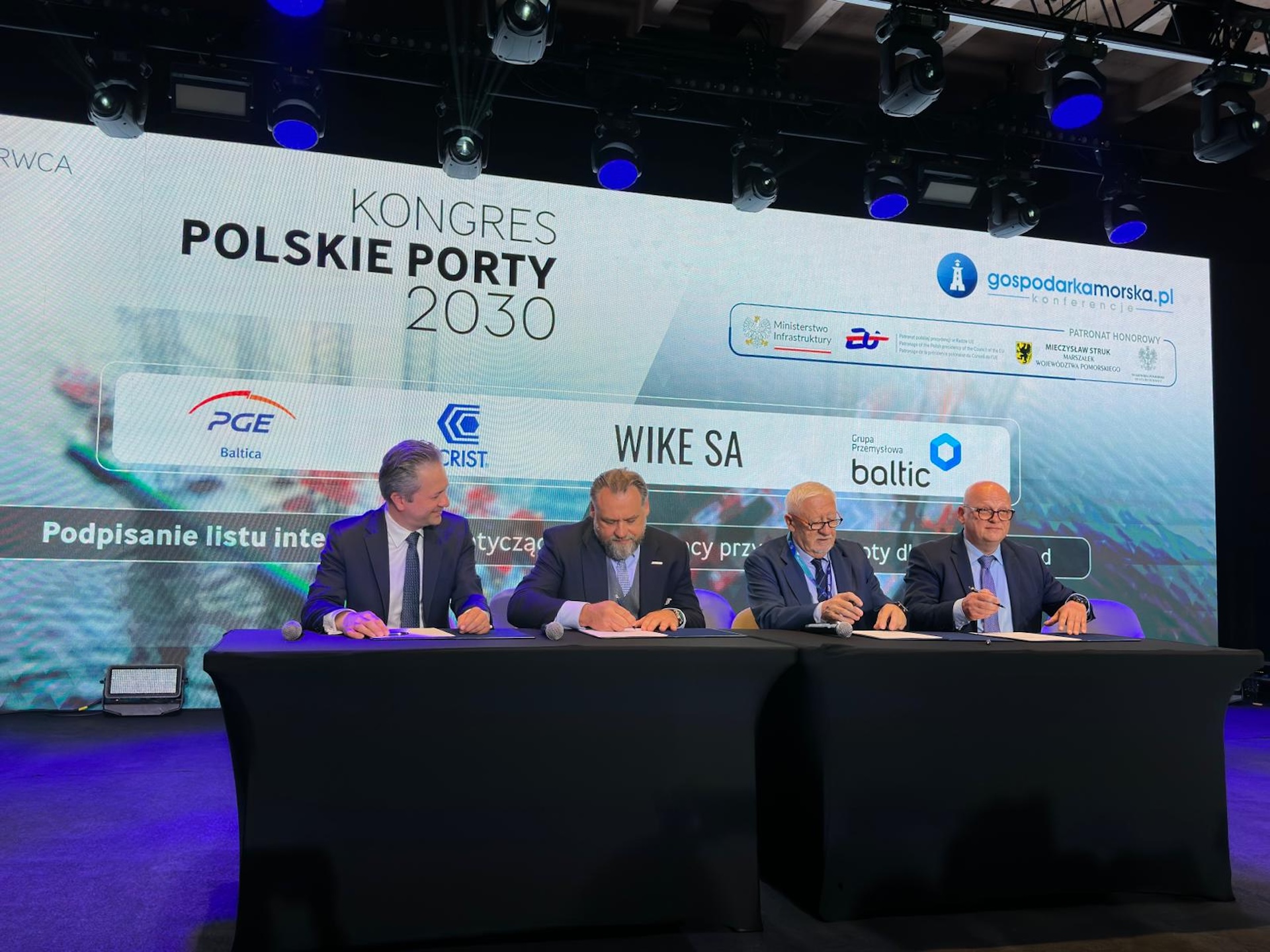 Kolejny ważny nie tylko dla branży, ale dla całej gospodarki dokument podpisany na scenie Kongresu Polskie Porty 2030: list intencyjny dotyczący współpracy przy rozwoju floty dla offshore wind. Sygnują: Piotr Dziubałtowski - wiceprezes PGE Baltica, Ireneusz Ćwirko - prezes Stoczni CRIST, Wojciech Kąkol - prezes WIKE, Adam Kowalski - prezes Grupy Przemysłowej Baltic.