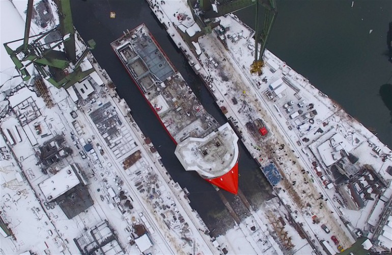 Wodowanie pierwszego statku w Stoczni Nauta w Gdańsku - pokazowy film z lotu ptaka