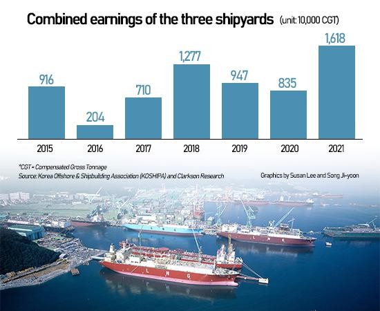 Koreańskie stocznie koncentrowały się na statkach o wysokiej wartości dodanej. Przejęły 65% kontraktów na gazowce, w tym zbiornikowce LNG. Rok zamknęły z zamówieniami na 10,12 mln CGT, Dla porównania, zamówienia na kontenerowce wyniosły 4,26 mln CGT. Chińscy stoczniowcy zdobyli 6,76 mln CGT kontraktów na kontenerowce oraz 4,4 mln CGT na zbiornikowce LNG i 3,32 mln CGT na masowce.