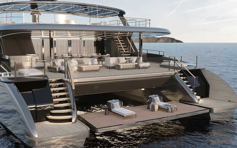 Pokład rufowy Sunreef 43M Eco wita gości rozległą przestrzenią wypoczynkową, łączącą platformę hydrauliczną i dwie rozkładane platformy boczne.