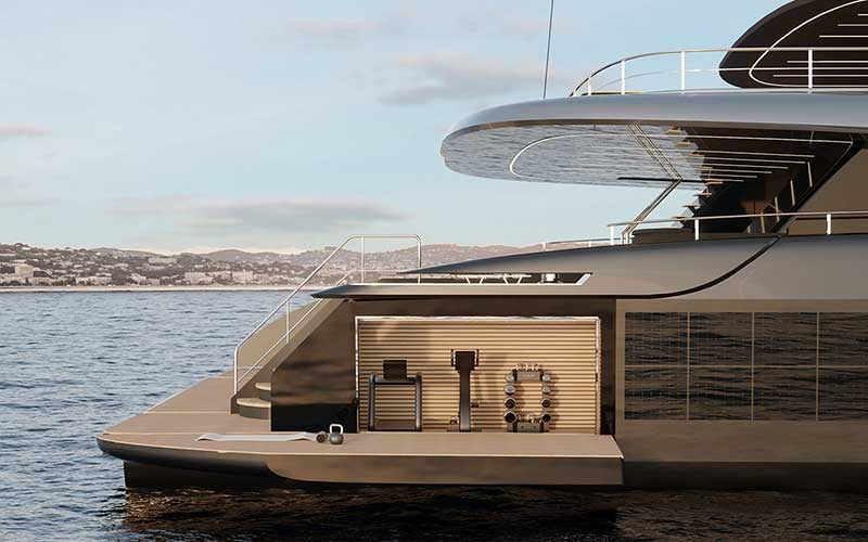 Ta w pełni personalizowana część superjachtu może pomieścić pokój do masażu z widokiem na ocean, bar oraz strefę fitness. Niewidoczny garaż na rufie jachtu kryje dwa duże skutery wodne oraz elektryczne sprzęty wodne.