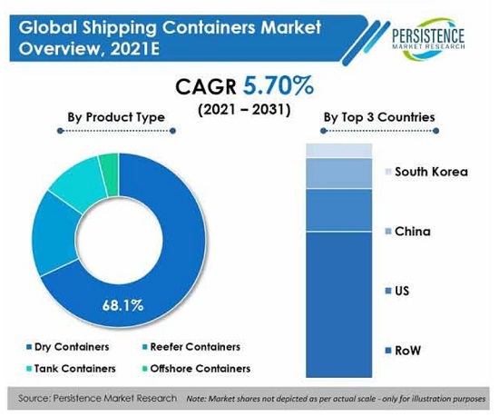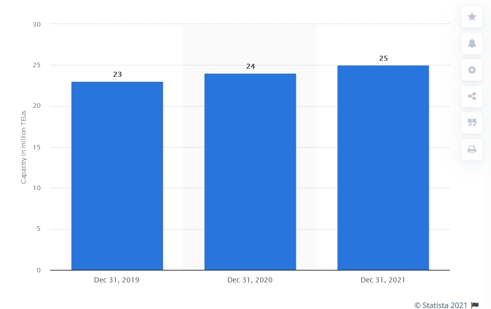 Rynek kontenerowców szacowany jest na ponad 6250 statków o łącznej pojemności prawie 25 mln TEU. To produkcja pochodząca dziś głownie w stoczniach Korei Płd i Chin. W portach przeładowuje się rocznie około 830 mln TEU kontenerów. Przewozy towarów w kontenerach wzrosły z około 102 mln t w 1980 roku do około 1,83 mld t w 2017 roku i przekroczą 2 mld t w 2021 roku.