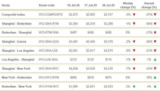 Wysoka podaż kontenerów i utrzymujący się popyt na przestrzeń ładunkową nie wywołał jednak wzrostu frachtów za przewozy kontenerów i ładunków w kontenerach między głównymi rynkami. Stawki spadają konsekwentnie od połowy czerwca, co wskazuje, że początkowy wpływ cła na rynek nie był trwały.