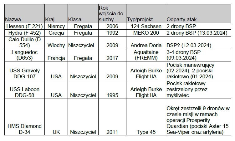 Okręty wojenne państw wchodzących w skład sił zadaniowych podległych dowódcom poszczególnych operacji Aspides i Prosperity Guardian zmuszone są do stałego zwalczania zagrożeń ze strony dronów powietrznych oraz rzadziej pocisków manewrujących (tabela). Z udziałem duńskiej fregaty Iver Huitfeldt w misji dowodzonej przez USA związana jest dymisja szefa sił zbrojnych tego państwa, generała Flemminga Lentfera. Załoga okrętu przez pół godziny miała starać się użyć systemu zwalczania celów powietrznych ESSM, natomiast pociski wystrzelone z armaty średniego kalibru miały eksplodować zbyt szybko w dodatku w pobliżu własnego okrętu. Po tym czasie fregata miała użyć z powodzeniem 3 pocisków przeciwlotniczych, jak i 50 – 100 pocisków artyleryjskich do zniszczenia 4 dronów. Prawdziwy problem polega jednak na tym, iż kłopoty tego typu były znane przełożonym od lat. Podobnie raport dowódcy okrętu ze zdarzeń z feralnego dnia 9 marca miał nie dotrzeć do ministra obrony.