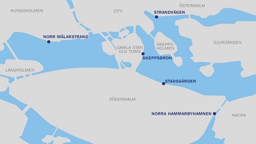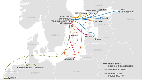 Główne połączenia liniowe z obszaru portowego zlokalizowanego wokół Sztokholmu.