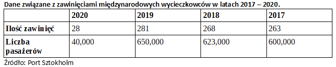 Sztokholmski port w sezonie wakacyjnym zawsze był odwiedzany przez licznie przypływające tutaj wycieczkowce wszystkich najważniejszych linii żeglugowych świata. Dzięki atrakcjom turystycznym, odpowiedniej infrastrukturze a także aktywnej przynależności do organizacji Cruise Baltic oraz odpowiedniej związanej z tym polityce Sztokholm stał się też portem bazowym wielkich wycieczkowców, co oznacza, że wiele z oferowanych rejsów zaczyna się lub kończy właśnie w tym miejscu. Pomimo pandemii w 2020 roku udało się zrealizować aż 28 zawinięć statków pasażerskich.