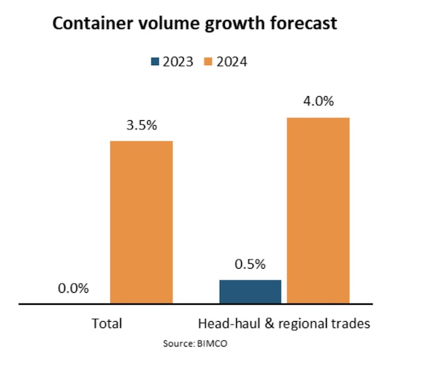 – Prognozujemy, że globalny wolumen kontenerów wzrośnie od -0,5% do 0,5% w 2023 r. i od 3,0% do 4,0% w 2024 r. Łączny wolumen handlu towarowego i regionalnego radzi sobie już coraz lepiej. Przewidujemy wzrost na poziomie od 0,0% do 1,0% w 2023 r. i od 3,5% do 4,5% w 2024 r. – informuje BIMCO w październikowej prognozie rynku kontenerowego.