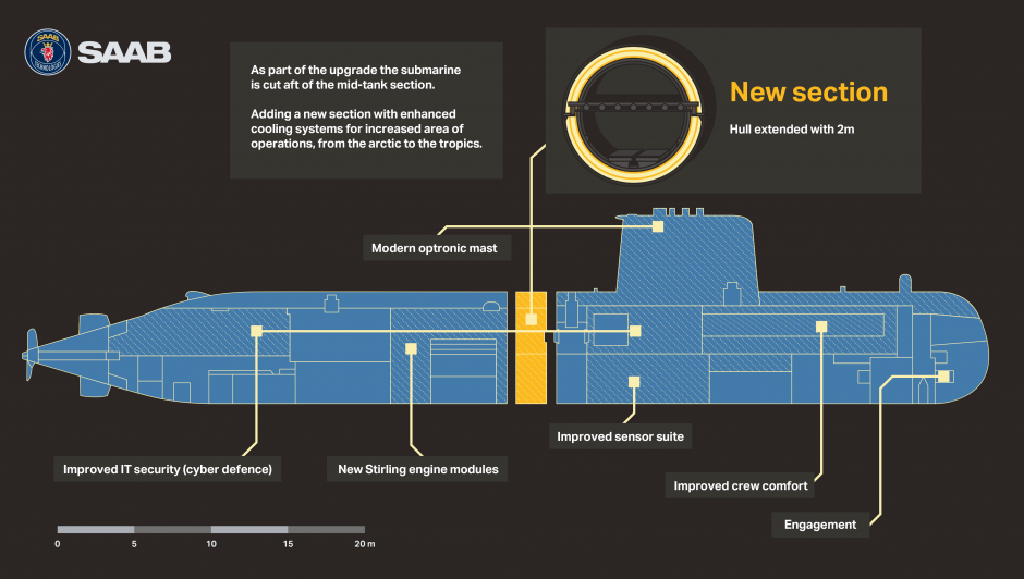 Rząd Szwecji i koncern Saab-Kockums również ściśle współpracują, aby zapewnić optymalne rozwiązania w zakresie zwalczania niebezpieczeństw, także tych podwodnych, biorąc pod uwagę interes państwa w tym zakresie, m.in. celem ochrony podmorskich kabli światłowodowych i rurociągów. Władze w Sztokholmie prowadzą długoterminowy plan finansowania sektorów związanych z obronnością, wspierając też postęp technologiczny. Politycy i przedstawiciele koncernu podkreślają znaczenie szerokich inwestycji w sektorze obronnym i tzw. „high-tech” jako środka pozytywnego w kontekście wzrostu gospodarczego Szwecji i partnerów zagranicznych, w tym Polski.