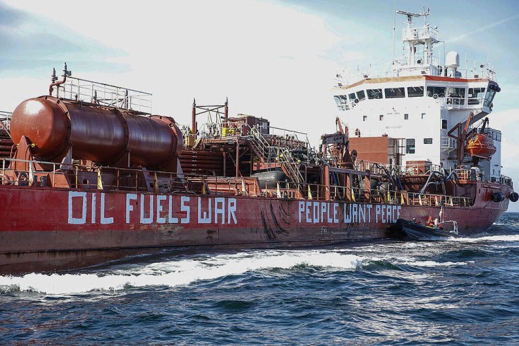 Uczestnicy akcji podpłynęli w piątek rano gumowymi pontonami do tankowca Zircone i namalowali na jego burcie napis: "Oil fuels war - People want peace" (Ropa napędza wojnę - ludzie chcą pokoju).