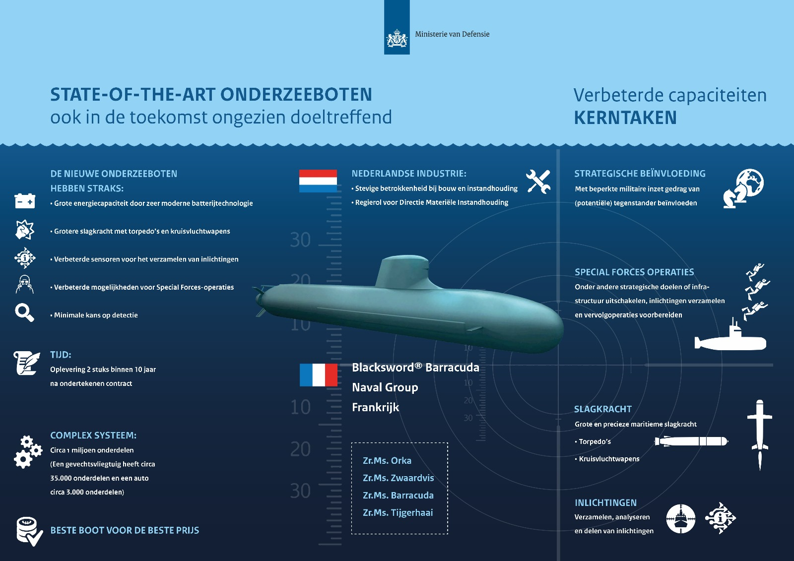 Ministerstwo Obrony Holandii ogłosiło, kto dostarczy nowe okręty podwodne dla Królewskiej Marynarki Wojennej Holandii (Koninklijke Marine). Wykonawcą będzie francuska firma Naval, która dostarczy cztery okręty serii Barracuda. Informacja wywołała niemałe zdziwienie w kraju i są podejrzenia, że może skończyć się skandalem, gdyż spodziewano się, że zwycięży rodzimy Damen działający w konsorcjum wraz z szwedzkim Saab.
