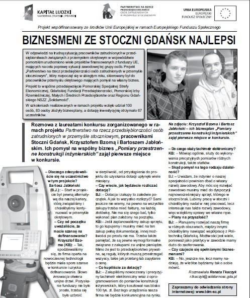 Nasz biznes plan zajął pierwsze miejsce w programie \" Partnerstwo na rzecz osób zatrudnionych w przemyśle stoczniowym\", który realizowany był w ramach programu Kapitał Ludzki w latach 2009-2010.