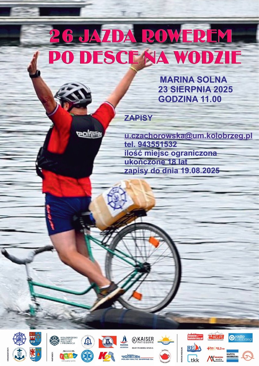 Urząd Miejski w Kołobrzegu i MOSiR Kołobrzeg zapraszają na zawody ,,Jazda rowerem po desce na wodzie”, które odbędą się 23 sierpnia w Marinie Solnej. Współorganizatorem wydarzenia jest również Zarząd Portu Morskiego Kołobrzeg.