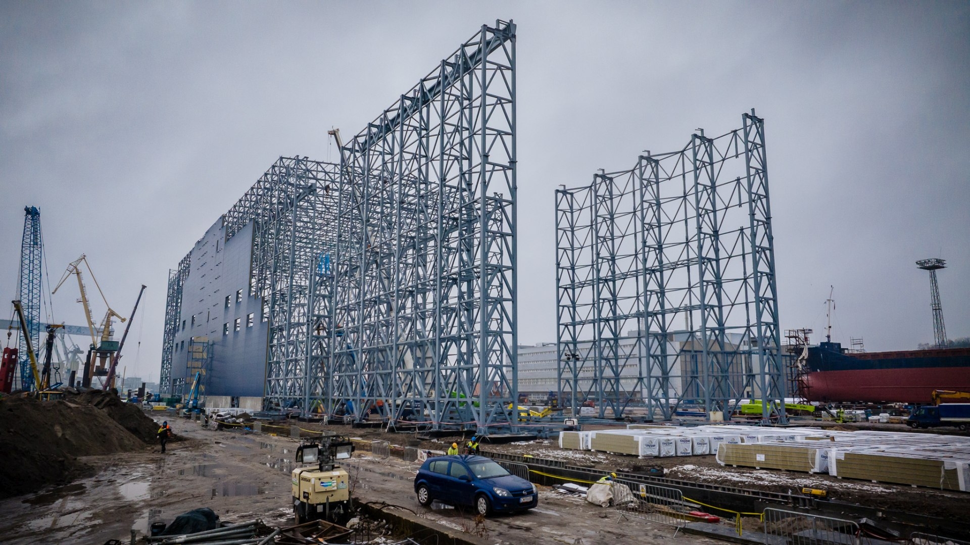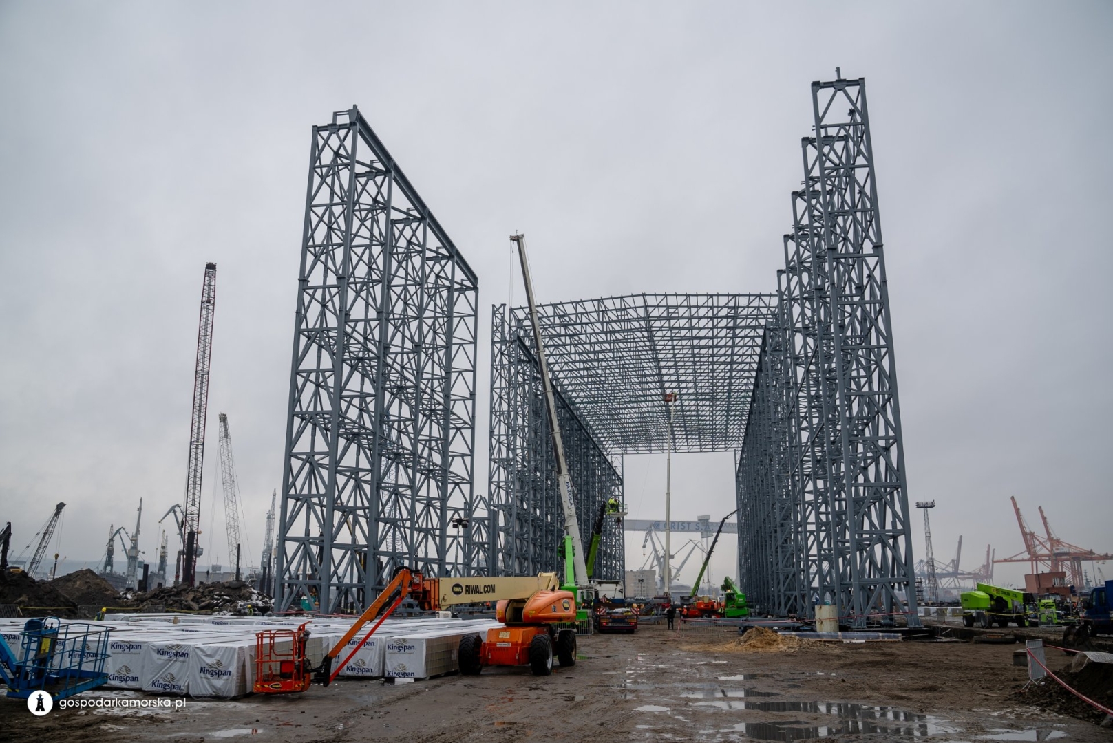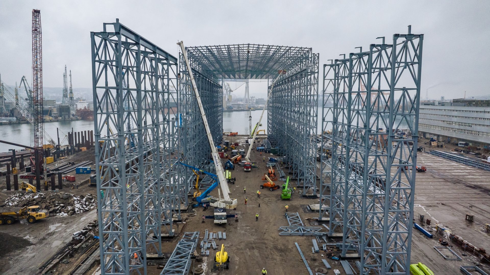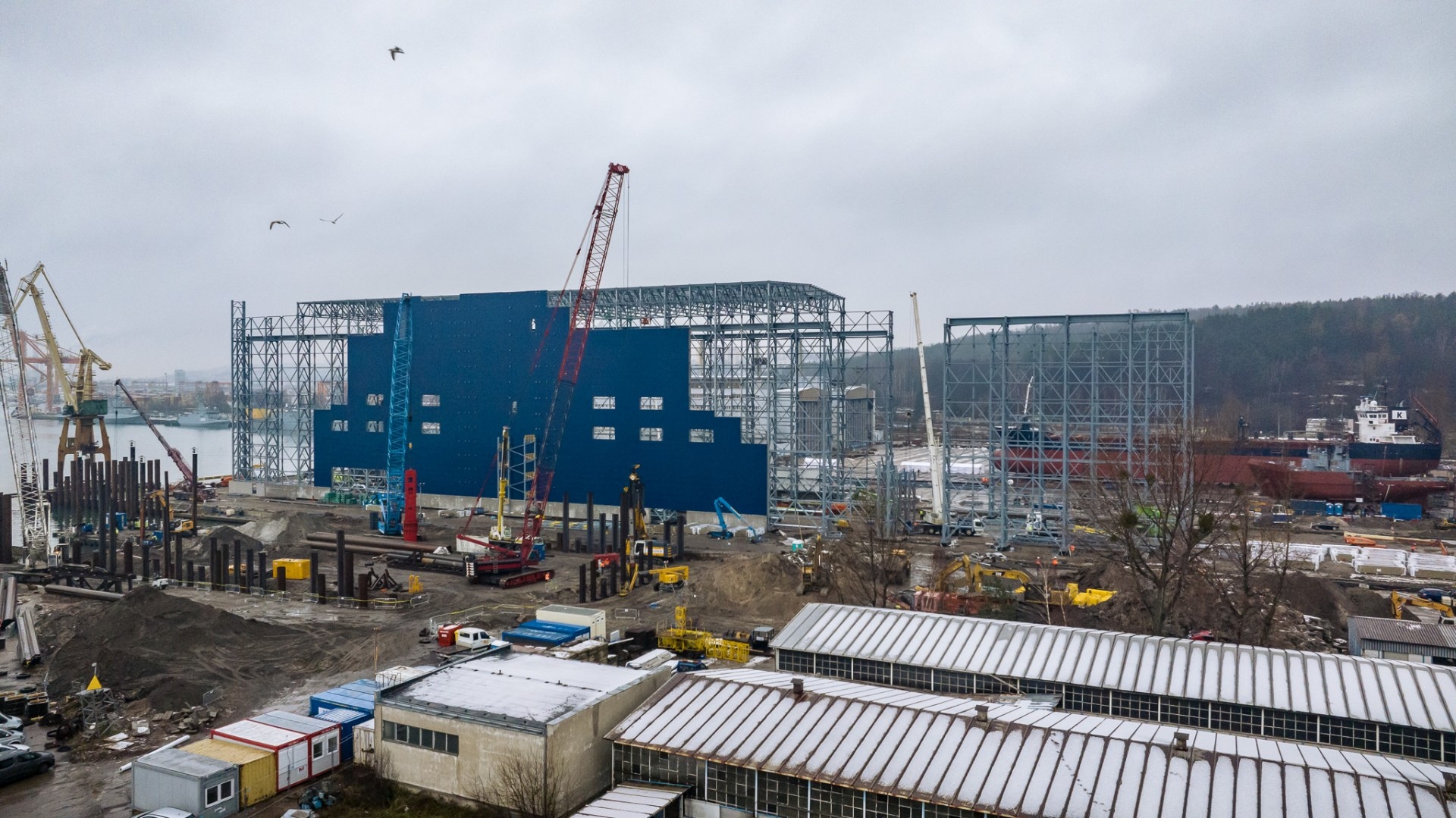 Aktualnie trwa montaż ostatnich słupów i dźwigarów dachowych. Rozpoczyna się także instalacja zewnętrznej klatki schodowej, obudowy dachu oraz maszynowni do jednej z największych bram w Polsce (dostawa i scalanie elementów jeszcze w tym roku). Równolegle z robotami konstrukcyjnymi trwa montaż płyt elewacyjnych na ścianach północnej i południowej, zaś wewnątrz hali rozpoczęto już instalację elementów wentylacji. Przedsięwzięcie realizuje konsorcjum składające się ze spółek NDI S.A., NDI SOPOT S.A. oraz Pekabex BET, odpowiedzialne za powstanie nowych obiektów, a także przebudowę już istniejącej infrastruktury. W ramach inwestycji realizuje także rozbudowę i przebudowę nabrzeża, placów składowych i dróg wewnętrznych wraz z modernizacją infrastruktury technicznej na terenie PGZ Stocznia Wojenna. Według założonego planu prace mają się zakończyć w czerwcu 2024 roku.