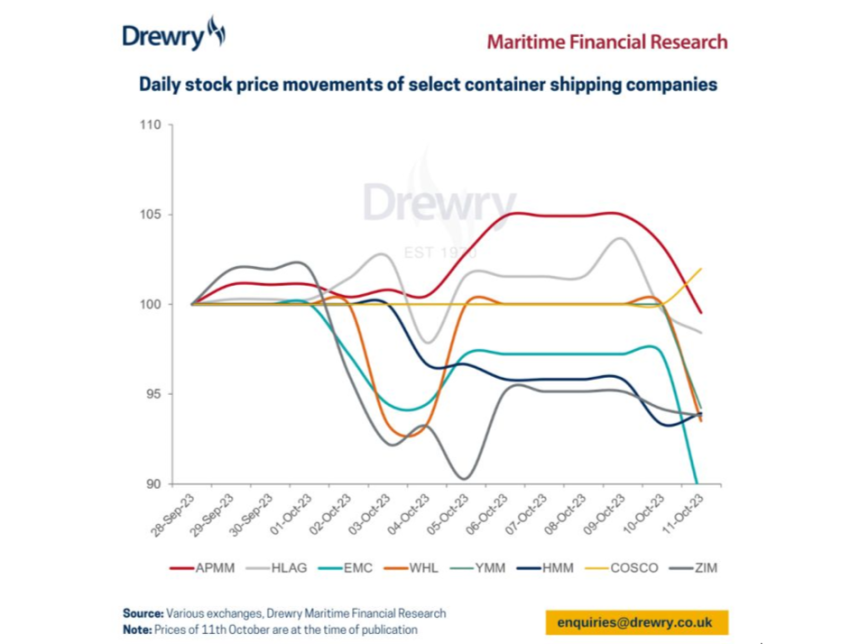 - Ceny akcji największych firm żeglugi kontenerowej spadły od 1,1% do 6,8% od zamknięcia 9 października do dzisiaj. Akcje Evergreen Marine Corp spadły o 6,8%, Yang Ming Marine Transport Corp o 5,4%, A.P. Moller Maersk zmalały o 4%, Wan Hai Lines Ltd zmniejszyło wartość na akcji o 3,6%, Hapag-Lloyd o 3,2%), HMM o 2,6% i ZIM Integrated Shipping Services Ltd. O 1,1%) – podaje na Linkedin Aditi Niranjan, Equity Research Analyst z New Delhi.