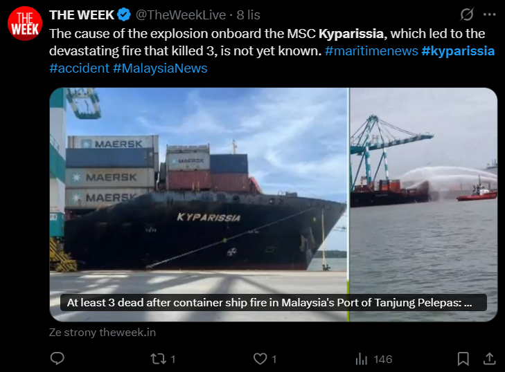 A tragic incident has occurred at Malaysia’s Port of Tanjung Pelepas (PTP) today, November 7, 2025. The container ship MSC Kyparissia caught fire during… pic.twitter.com/Wjv0bLgSiF