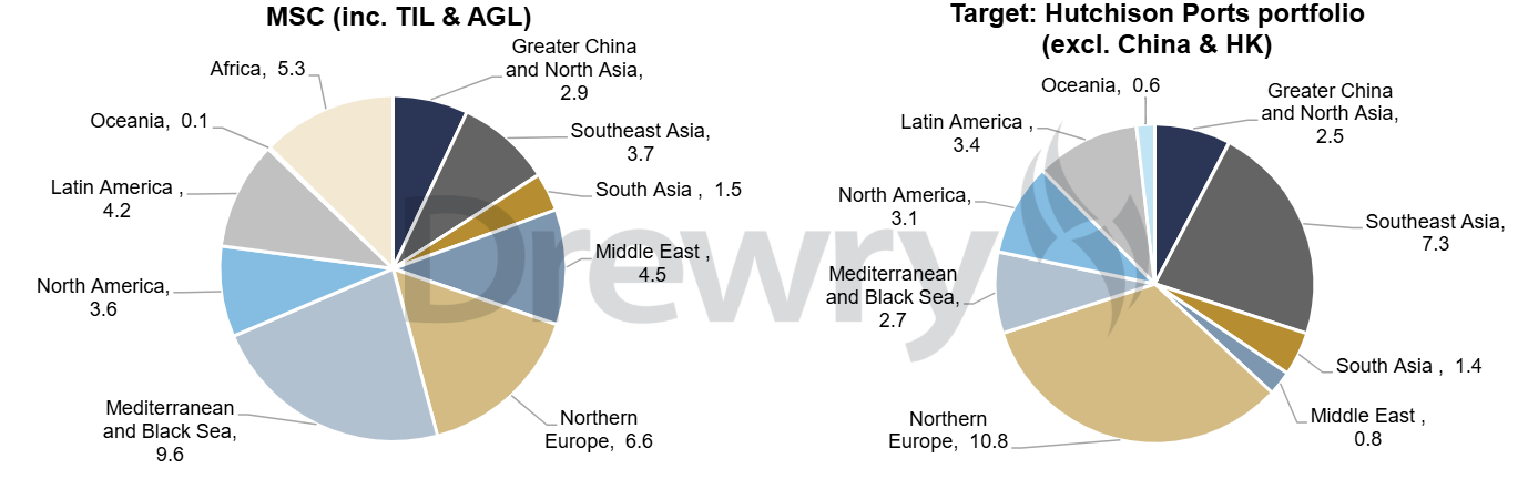 Obecność kapitałowa MSC i Hutchison Ports w terminalach portowych w podziale geograficznym (przepustowość skorygowana o udziały kapitałowe, 2023), źródło: www.drewry.co.uk
