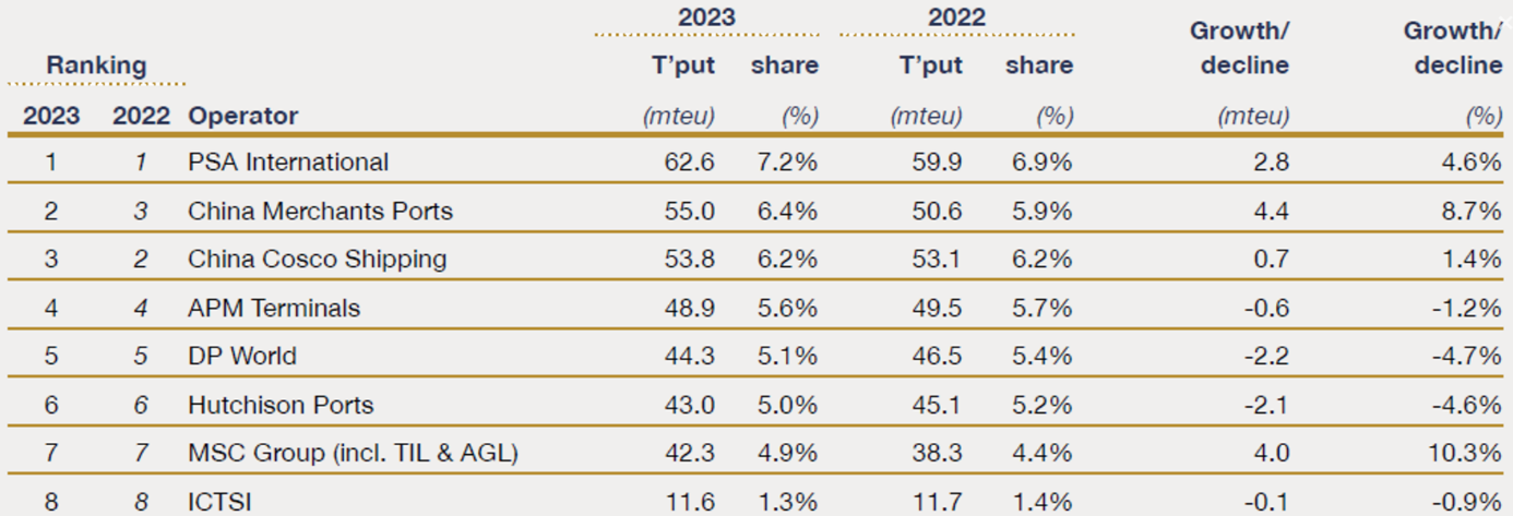 Najwięksi na świecie operatorzy portowi w latach 2022–2023 (w mln TEU / % udziału w światowej przepustowości terminali kontenerowych), źródło: www.drewry.co.uk