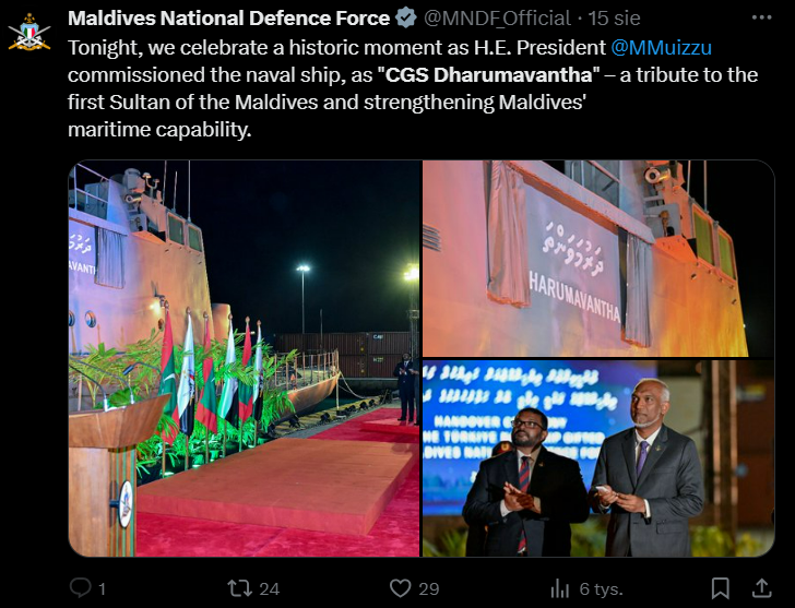 Tonight, we celebrate a historic moment as H.E. President @MMuizzu commissioned the naval ship, as "CGS Dharumavantha" – a tribute to the first Sultan of the Maldives and strengthening Maldives' maritime capability. pic.twitter.com/oJEsI9G3lT