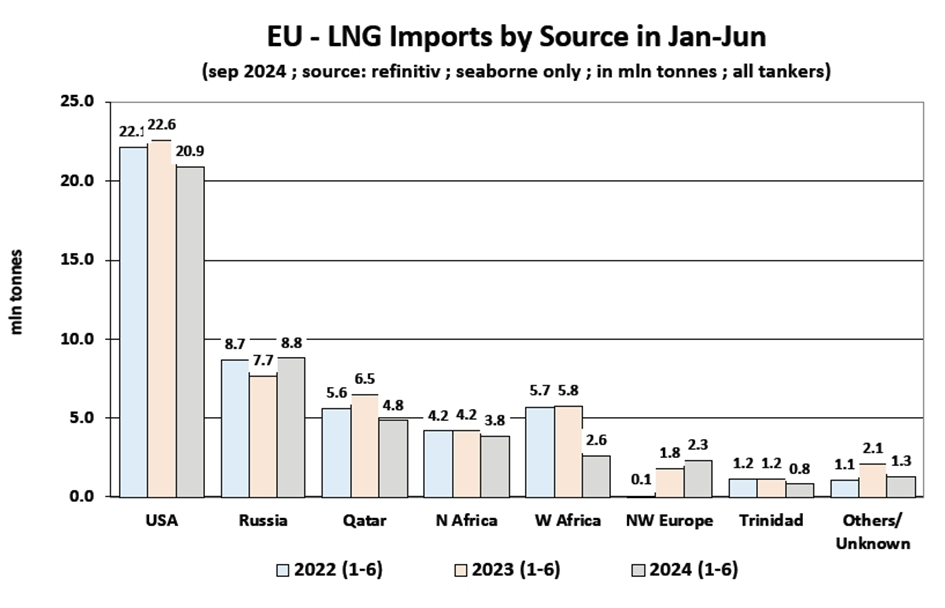 Unia Europejska utrzymuje pozycję największego importera LNG na świecie. W I połowie 2024 r. UE sprowadziła drogą morską 45,4 mln ton LNG. Było to 22% globalnego udział w rynku importu LNG. Mimo, że zanotowano spadek popytu gospodarek UE na gaz sprowadzany drogą morską o 12,2% r/r.