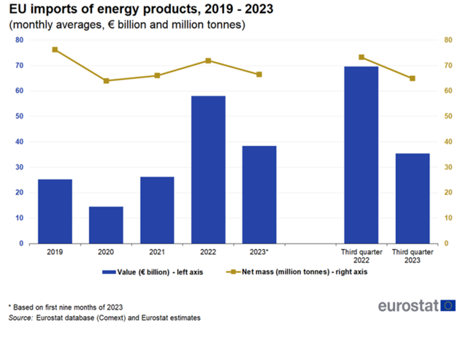EUROSTAT zwraca uwagę, że „obserwowane znaczne wahania w imporcie ropy UE – MG] są konsekwencją dużej zmienności cen. Udział ropy naftowej [w ujęciu wartościowym – MG] w całości importu UE wzrósł z 9,1% w 2021 r. do 11% w 2022 r. i nieznacznie spadł do 10,6% w pierwszych trzech kwartałach 2023”.