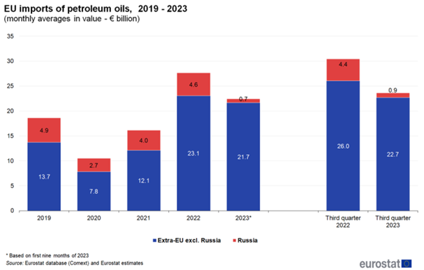Ograniczony sankcjami import ropy naftowej z Rosji gwałtownie spadł w okresie I–III kw. 2023 ze względu na unijny zakaz. Za ropę naftową z Rosji kraje UE płaciły średnio 0,7 mld euro miesięcznie w 2023 r. W 2022 r. do eksporterów rosyjskiej ropy trafiało 4,6 mld euro.