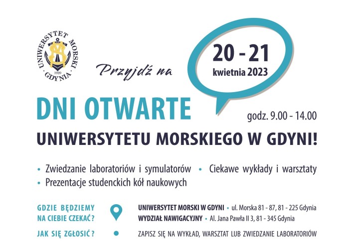Wydarzenie odbędzie się w budynku głównym przy ul. Morskiej 81-87 oraz na Wydziale Nawigacyjnym przy al. Jana Pawła II 3 na Skwerze Kościuszki w Gdyni. Podczas Dni Otwartych studenci opowiedzą o uczelni, tajnikach studiowania, życiu studenckim i praktykach morskich. W Auli im. Tadeusza Meissnera swoją działalność zaprezentują Koła Naukowe.