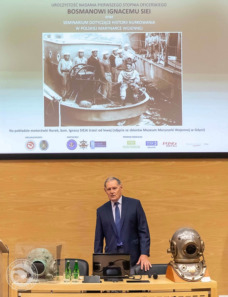 Do udziału w seminarium zaprosiliśmy osoby, które łączy zamiłowanie do historii i teraźniejszości nurkowania. Prelekcje poprowadzili: Kustosz Karina Kowalska z Muzeum Nurkowania Warszawskiego Klubu Płetwonurków pt. „Bosman Ignacy SIEJA – pierwszy instruktor nurkowania w Marynarce Wojennej II RP”, kmdr Robert Szymaniuk Dowódca Dywizjonu Okrętów Wsparcia pt. „Interwencyjne prace podwodne a bezpieczeństwo morskie państwa” oraz kmdr por. Piotr Torebko Komendant Ośrodka Szkolenia Nurków i Płetwonurków WP nt. „Oczyszczania akwenów przez grupy nurków minerów Dywizjonu Trałowców z przedmiotów wybuchowych i niebezpiecznych”. Gościnnie wystąpił Wiesław Wachowski z HDS-Poland, inicjator pośmiertnych nominacji na stopnie oficerskie nurkom polskiej Marynarki Wojennej II RP.