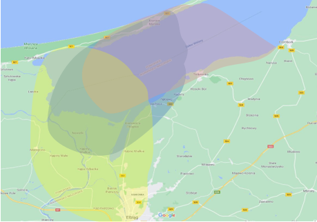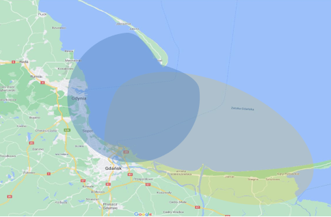 Rys. 3 Schematyczna ilustracja zasięgów pracy istniejących stacji nadawczych systemu RTK Zatoka Gdańska. Kolorami zaznaczono odpowiednio: niebieski – stacja Hel, żółty – stacja Gdańsk Port Północny