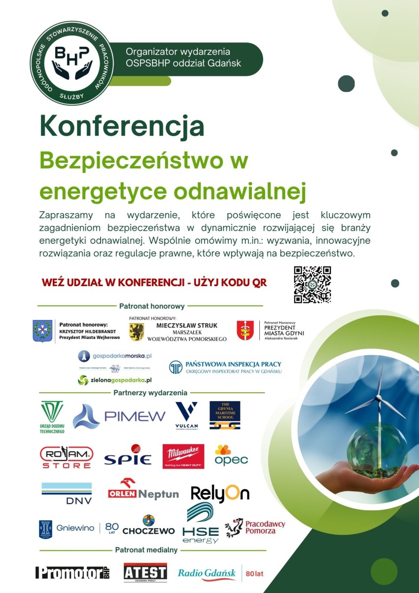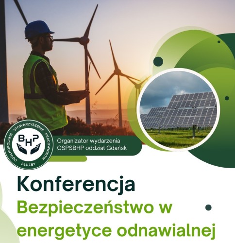 Zarząd gdańskiego oddziału Ogólnopolskiego Stowarzyszenia Pracowników Służby BHP organizuje w dniach 22-23 maja konferencję pt. "Bezpieczeństwo w energetyce odnawialnej". Celem tego wydarzenia jest pogłębianie wiedzy w tematyce energii odnawialnej, a także jej kierunków jej rozwoju na Pomorzu, co wiąże się również z kwestiami bezpieczeństwa pracowników branży i potrzebami rynku pracy w obszarze BHP okiem również pracodawców. Swoją perspektywę na te wyzwania mają przedstawić zarówno specjaliści zajmujący się zagadnieniem BHP, jak i przedstawiciele firm i podmiotów zaangażowanych w rozwój energetyki odnawialnej w regionie.
