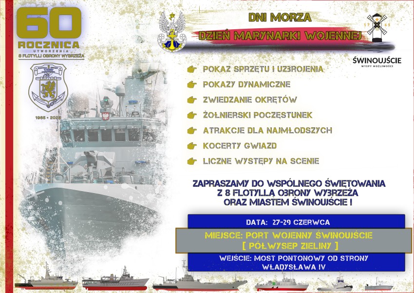 W ostatni weekend czerwca odbędzie się tradycyjny Dzień Marynarki Wojennej, który tradycyjnie zamyka obchody Święta Morza. W tym roku szczególną okazję do świętowania mają także 8. Flotylla Obrony Wybrzeża, obchodząca swoje 60-lecie, oraz Świnoujście, które świętuje 260. rocznicę nadania praw miejskich. Z tej wyjątkowej okazji bramy Portu Wojennego Świnoujście zostaną otwarte dla zainteresowanych zapoznaniem się z działalnością morskiego rodzaju sił zbrojnych. To także pierwsze obchody w nowej formule, gdyż dotychczas wtedy obchodzono również Święto Marynarki Wojennej, które w ubiegłym roku przeniesiono na listopad.