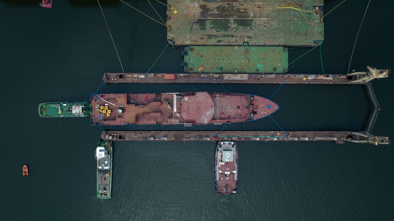 najpierw został przesunięty z nabrzeża do pływającego doku, a po