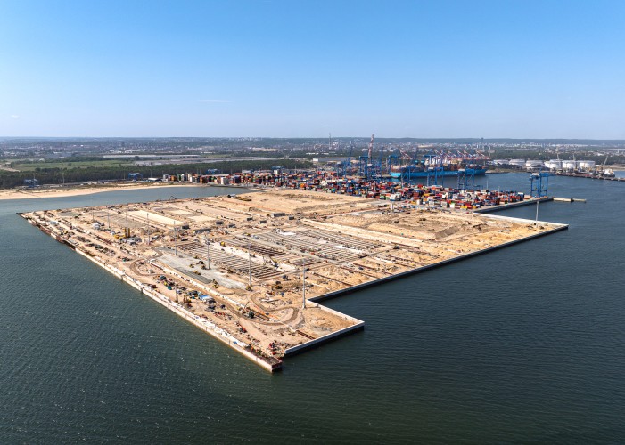powstałej wyspie trwają kolejne etapy prac budowlanych. Nowe nabrzeże o