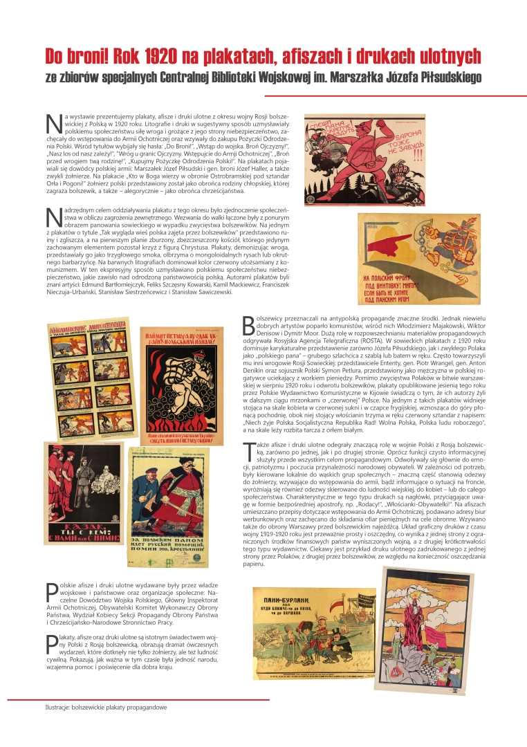 Mając na uwadze setną rocznicę Bitwy Warszawskiej oraz zbliżające się Święto Wojska Polskiego, 8. Flotylla Obrony Wybrzeża im. Wiceadmirała Kazimierza Porębskiego przygotowała dla mieszkańców i turystów naszego miasta patriotyczną wystawę plakatów i ulotek z 1920 roku. Wystawa została opracowana graficznie ze zbiorów specjalnych Centralnej Biblioteki Wojskowej im. Marszałka Józefa Piłsudskiego w Warszawie.