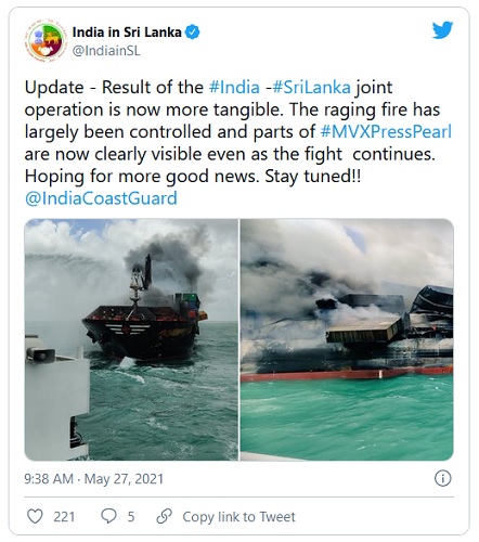W międzyczasie trwa gaszenie pożaru na pokładzie statku. Na miejscu pracują trzy holowniki przeciwpożarowe, helikopter oraz marynarka wojenna Sri Lanki i indyjska straż przybrzeżna.