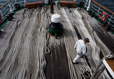 Laureatem trzeciego miejsca został Kacper Kamecki, student nawigacji Uniwersytetu Morskiego w Gdyni. Zdjęcie „Niedzielna kontrola komendancka” wykonał podczas praktyk na pokładzie żaglowca „Dar Młodzieży”. Na zdjęciu starszy bosman kontroluje stan cum, co, jak opowiadał nam autor, należy do niedzielnych zwyczajów porządkowych na statku.