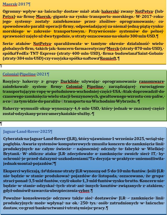 Przykłady realnych szkód z ostatnich lat pokazują, że cyberataki mogą paraliżować porty, terminale czy też systemy zarządzające łańcuchami dostaw (w tym systemy infrastruktury krytycznej), a nawet doprowadzić do bankructw i poważnych globalnych kryzysów (np. kryzys bezrobocia).