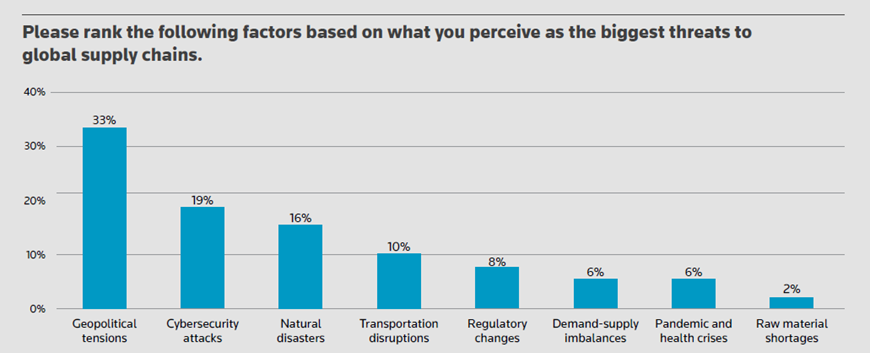 Raport „Future-Proofing Supply Chain Operations: Leveraging Technology For Lasting Impact” przygotowany we współpracy Reuters Events i CargoWise (platforma dla branży logistycznej) pokazuje, że ataki cybernetyczne to drugie najczęściej wymieniane przez specjalistów ds. logistyki zagrożenie dla łańcucha dostaw (na pierwszym miejscu znalazły się napięcia geopolityczne).