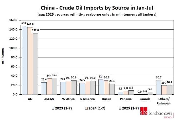 W 2025 r. (do lipca) wolumen importu ropy naftowej do Chin zmalał 3,7% r/r do 285,4 mln ton, ponieważ w analogicznym okresie ubr. Chiny sprowadziły 296,3 mln ton ropy. Import tegoroczny jest lepszy niż uzyskany w okresie styczeń-lipiec 2022 r., kiedy zbiornikowcami sprowadzono do Chin 251,3 mln ton ropy. Około 84,8% ropy dostarczonej do Chin w okresie styczeń-lipiec 2025 r. przewieziono zbiornikowcami VLCC, około 3% dostarczono w zbiornikach Suezmax, a 11,6% statkami Aframax.