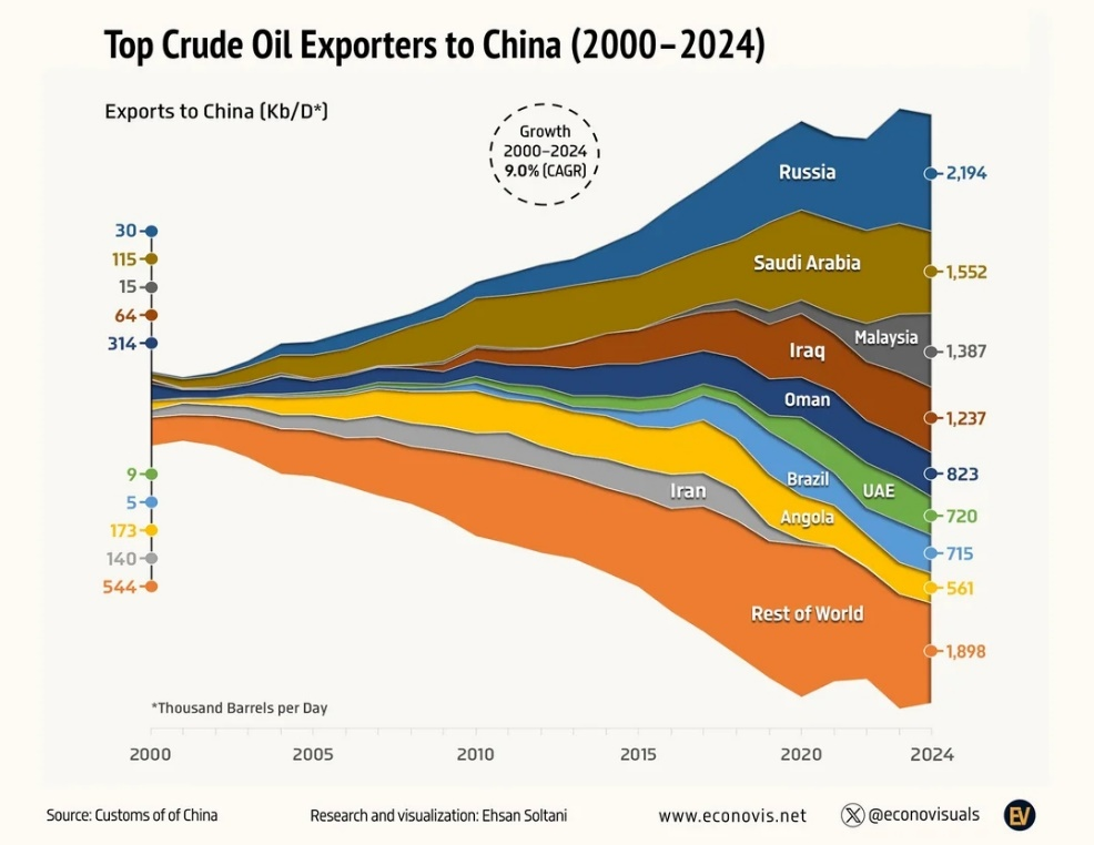 Jeśli chodzi o źródła dostaw, większość chińskiego importu ropy pochodzi z Bliskiego Wschodu. Arabia Saudyjska jest największym dostawcą ropy naftowej do Chin. Z pól naftowych tego kraju do końca lipca 2025 r. dotarło 44,3 mln ton ropy naftowej, czyli 15,5% importowanego wolumenu. W br. Chiny sprowadziły z Arabii Saudyjskiej o 4,1% mniej ropy porównując r/r, z analogicznym okresem ubiegłego roku. W tym samym okresie import z Iraku do Chin wzrósł o 0,6% r/r do 35,5 mln ton, a z Kuwejtu o 13,7% r/r do 8,5 mln ton.