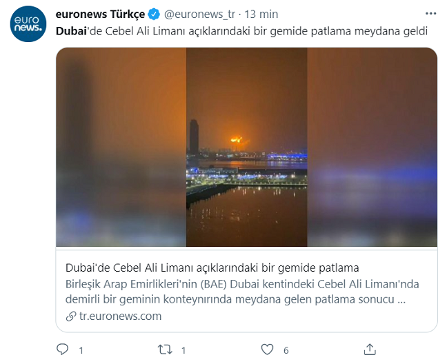 Przed północą czasu lokalnego w mediach społecznościowych pojawiły się filmy przedstawiające kulę ognia, oświetlającą nocne niebo. Wybuch słyszeli świadkowie mieszkający w dzielnicach mieszkaniowych w odległości do 22 km od portu w Dżebel Ali.